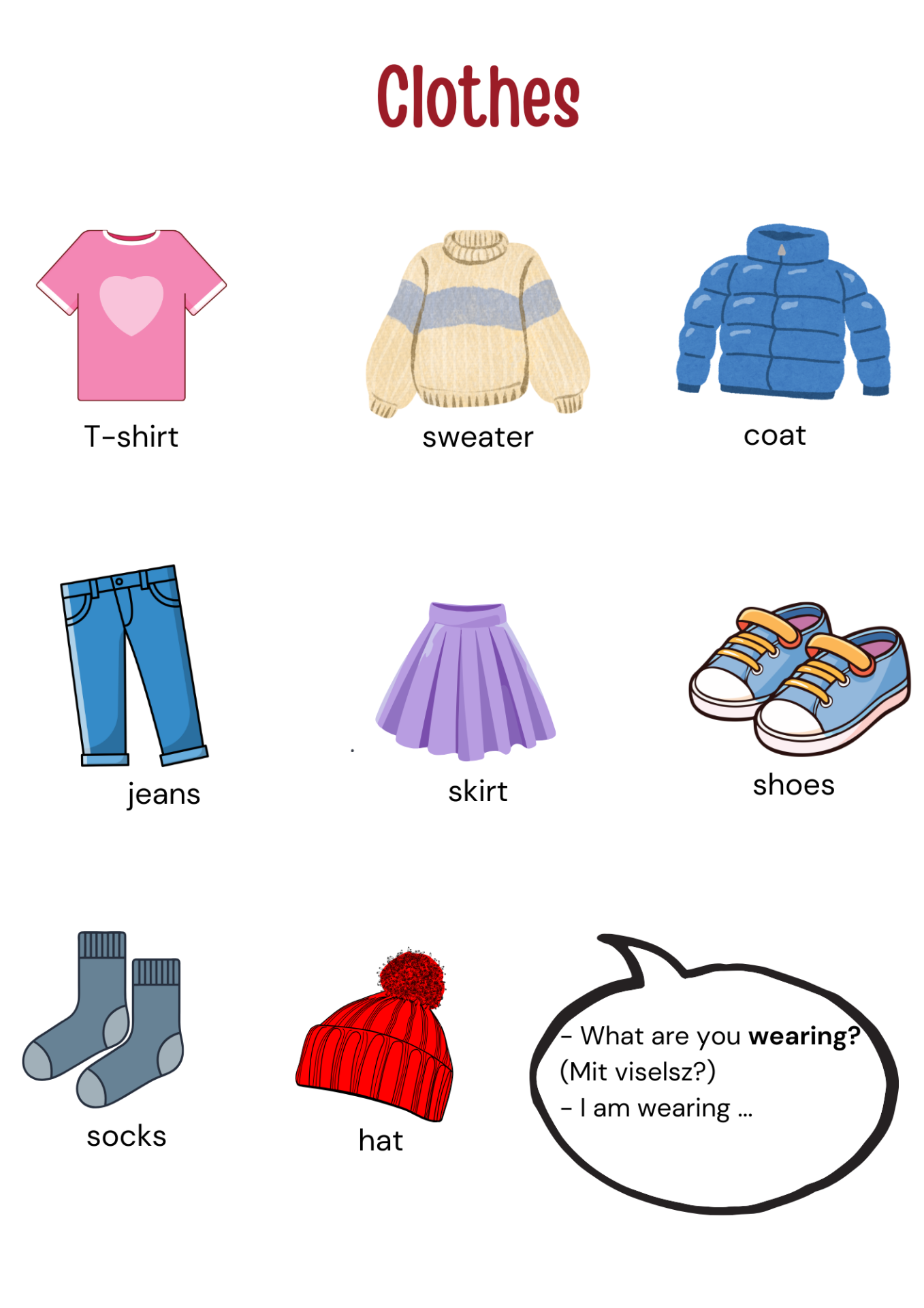 Melegben gyakori a t-shirt (póló), hűvösebb időben pedig a sweater (pulóver) és a coat (kabát). Alsó ruházatként sokan viselnek jeans-t (farmer) vagy skirt-öt (szoknya). A lábra shoes (cipő) és socks (zokni) kerül, napsütésben vagy hidegben pedig jól jön egy hat (sapka/kalap). Ezeknek a szavaknak az ismerete segít egyszerű mondatokban elmondani, ki mit visel az adott időjárásban.